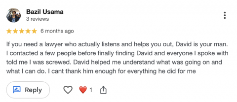 "If you need a lawyer who actually listens and helps you out, David is your man. I contacted a few people before finally finding David and everyone I spoke with told me I was screwed. David helped me understand what was going on and what I can do. I can't thank him enough for everything he did for me".