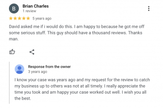 He got me a very favorable outcome in my case, and was very quick to communicate with me right after he had spoken to crown, and got me a wonderful resolution for my case, which could have gone so much worse. Also he was understanding and kind to me regarding my situation, and made a much more favorable solution to my issues which literally saved me. I'm so thankful for David and his expertise, kindness, and reliability. If myself or anyone I know ever ends up in a situation where legal representation is needed, I will go with and recommend David in half a heartbeat. Thank you so so much, David, from the bottom of mine & my family's hearts. You've done amazing to help me stay on the right path and I'm beyond grateful for you and everything that you've done for me over the last year or so. I can say with 100% certainty that David has saved me from a huge backward slide into a life I've fought so hard to get out of. I can't even express my gratitude to you !