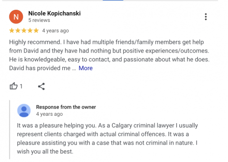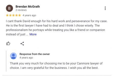 "I've used David on multiple occasions. I highly recommend him as one of the best lawyers in Alberta. Absolutely stress free. 100% committed to give the best advice possible to each client".
