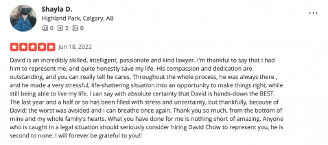 "David is incredibly skilled, intelligent, passionate and kind lawyer. I'm thankful to say that I had him represent me, and quite honestly save my life. His compassion and dedication are outstanding and you can really tell he cares. Throughout the whole process, he was always there and he made a very stressful life-shattering situation into an opportunity to make thing right, while still being able to live my life. I can say with absolute certainty that David is hands-down the BEST. The last year and a half or so has been filled with stress and uncertainty, but thankfully because of David; the worst was avoided and I can breathe once again. Thank you so much from the bottom of mine and my whole family's hearts. What you have done for me is nothing short of amazing. Anyone who is caught in a legal situation should seriously consider hiring David Chow to represent you. He is second to none. I will forever be grateful to you!"